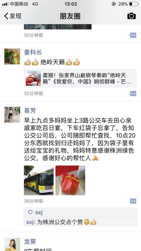 當(dāng)天中午1點,失主楊女士的女兒發(fā)朋友圈感謝綠色公交,感謝好心的幫忙人。