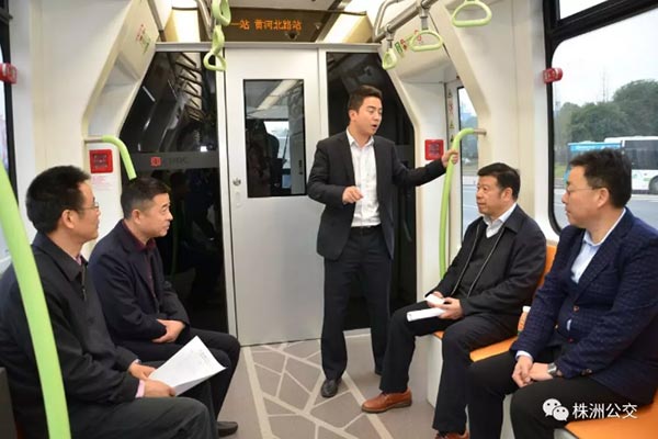 神農(nóng)城北ART站,省廳督導(dǎo)組一行受到了在此等候的株洲市交通運(yùn)輸局黨組副書記、副局長徐業(yè)偉,株洲公交總公司黨委書記、董事長肖長江等人的熱情接待。督導(dǎo)組一行饒有興致的登上智軌,干凈明亮的視窗,整潔舒適的車廂,平穩(wěn)的運(yùn)行乘車體驗(yàn),都令領(lǐng)導(dǎo)們贊不絕口。肖董事長在車上向督導(dǎo)組簡單的介紹了我市新能源公交車輛的推廣和應(yīng)用、ART智軌建設(shè)和營運(yùn)的相關(guān)情況。