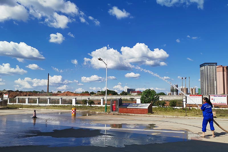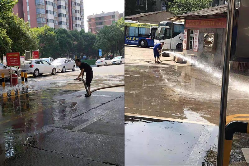 烈日當頭的中午,加油的車漸漸的少了,他們連水都來不及喝一口,給加油站的地面澆水濕地,給油站降降溫。