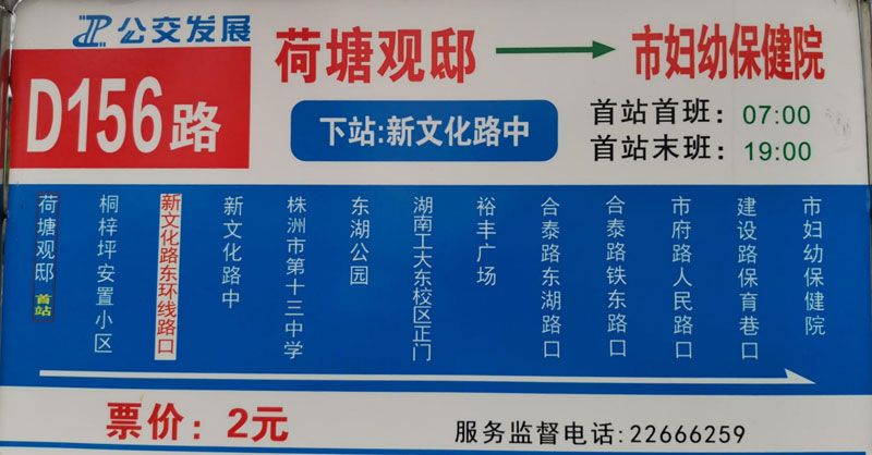 株洲公交新增D156路線路(荷塘官邸—市婦幼保健院)