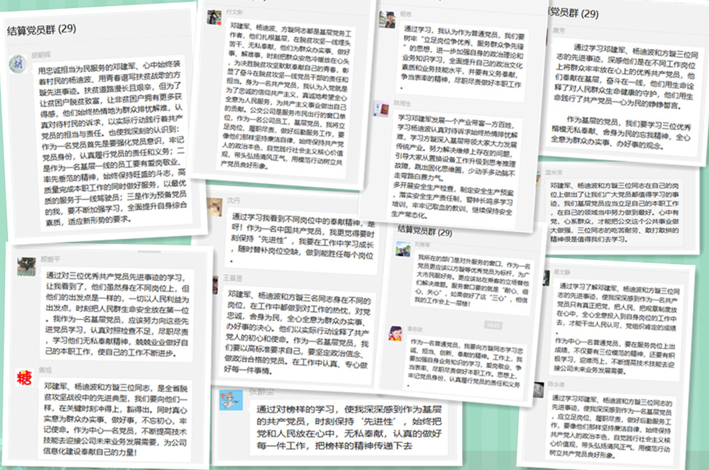為引導(dǎo)中心全體黨員進一步樹牢"四個意識",堅定"四個自信",做到"兩個維護",8月7日下午15:30,中心黨支部組織全體黨員開展了"線上學習鄧建軍、楊迪波、方璇同志先進事跡"活動。活動中,全體黨員結(jié)合自身工作實際,在群內(nèi)積極討論、踴躍發(fā)言。同時還認真學習了《習近平總書記關(guān)于全力做好防汛救災(zāi)工作重要指示精神》和《習近平總書記關(guān)于安全生產(chǎn)"十大論述"摘要》。