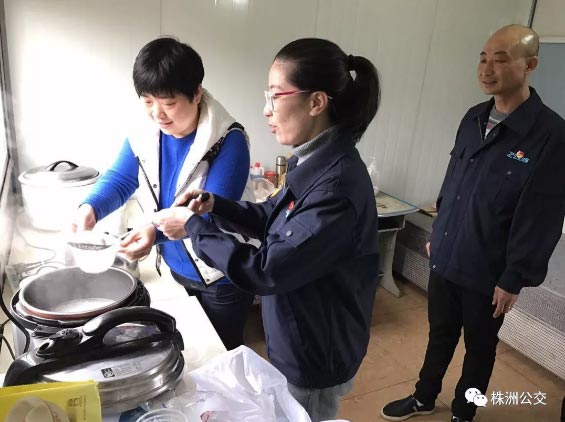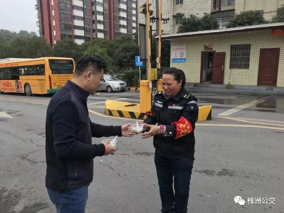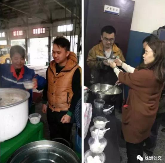 T88路站務室,發(fā)展公司支部書記易羚羊、物資公司支部書記倪霜霜為駕駛員煮湯圓、送湯圓。